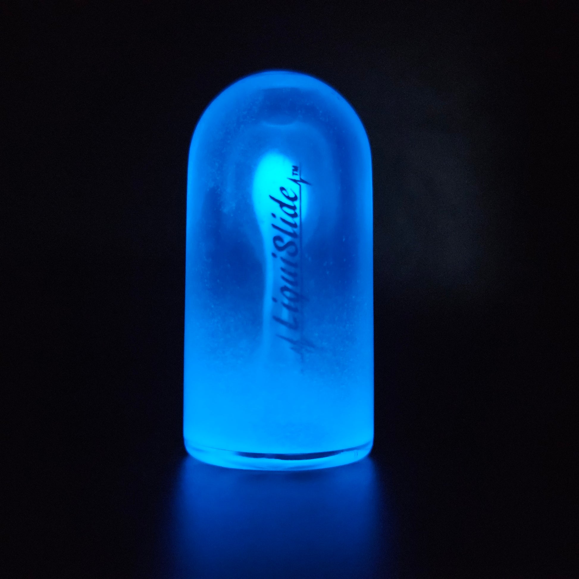 We added a glow-in-the-dark powder to our vegetable glycerin blend for a unique effect! The powder gathers at the bottom rim when the slide is set on its flat end. When you pick it up and turn it over, the powder drops and swirls through the glycerin, creating an addictive/trippy visual effect. Think 'Snowglobe' but inside a slide... and it glows!
